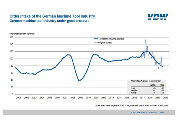 (更多詳情)法蘭克福,2020年5月29日。——2020年第一季度,德國(guó)機(jī)床行業(yè)接到的訂單比去年同期下降了25%。來(lái)自德國(guó)國(guó)內(nèi)的訂單減少了22%,來(lái)自德國(guó)以外