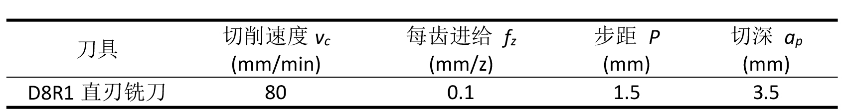 而后,便是對單工序加工難點的“逐個擊破”了。在完成型腔內部粗加工后,轉角部位還殘留有較多材料,且這些轉角大多十分狹窄,在其內進行粗精加工難度很大。初步的設計方案是采用小直徑直刃銑刀,以側銑方式進行,但很快便出現了小直徑刀具難以承受逐漸增大的切削力而折斷的問題,而若通過減少切深與進給速度來控制切削時刀具的載荷,又會極大影響加工效率。因此,國宏工具技術團隊便提出了采用插銑方式的可能性,并且直刃銑刀也非常適用于插銑工藝。在得到南航項目團隊認可后,經過多次加工實驗的國宏工具技術團隊確定了具體的工藝參數(如表1所示)。