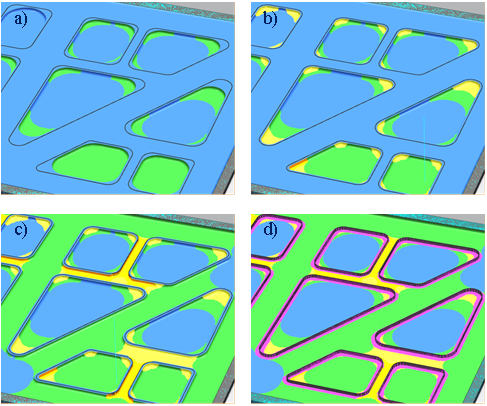 找到合適的刀具,僅是方案優化的第一步,如何優化設計加工工藝成為了擺在南航項目團隊面前的又一難題。根據以往的經驗,基于“短板優先”的原則,團隊先設計了總體加工工序——首先在板材上加工型腔(圖5 a)),從型腔中心位置螺旋下刀,切深達到槽腔深度后刀路逐步向外擴展,完成最薄弱的型腔內腹板的加工(圖5 b))。之后再進行槽銑,去除各型腔間的材料(圖5 c))。最后對型腔立筋結構的內外圈進行加工(圖5 d))。