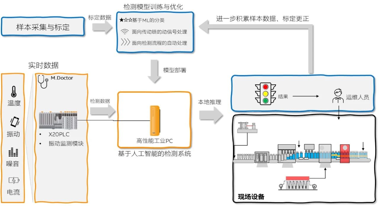它通過不斷的在現(xiàn)場各個場景中的數(shù)據(jù)樣本積累、標定,最終形成機器的“故障預測”能力,并部署于本地的 PC 系統(tǒng)中,由其對數(shù)據(jù)進行實時推理,并做出判斷。