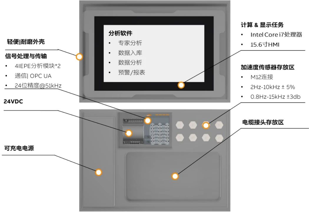M.Doctor 設(shè)計為一個便攜式的工具箱,配置了強大的硬件和智能分析軟件,可以用于機器現(xiàn)場的移動監(jiān)測。去掉箱子,直接集成到機器控制系統(tǒng)中,作為機器功能的構(gòu)成。